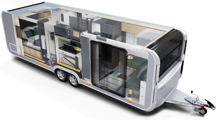 Adria New Astella 644 DP - Har perfekte indretning, med separat soveværelse og stor opholdsstue med panoramadøre. Lækkert badeværelse og stort køkken. Der er mulighed for ekstra opredning til to i siddegruppen. (Fås i flere forskellige udgaver.)