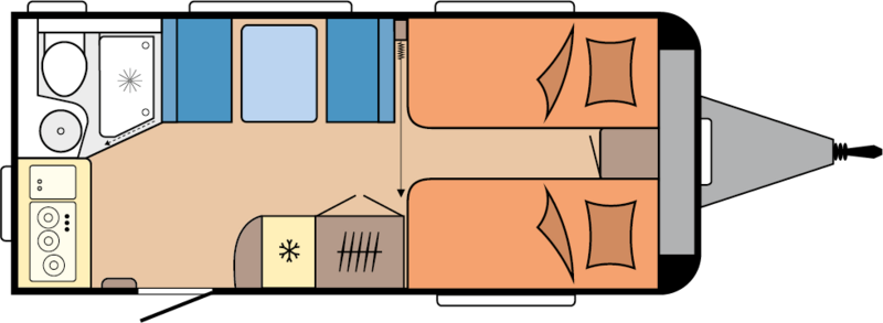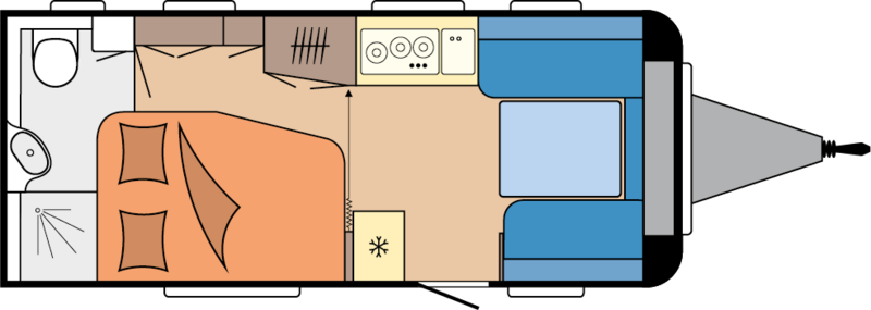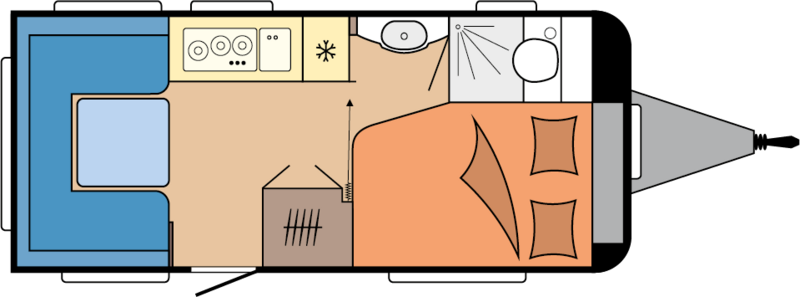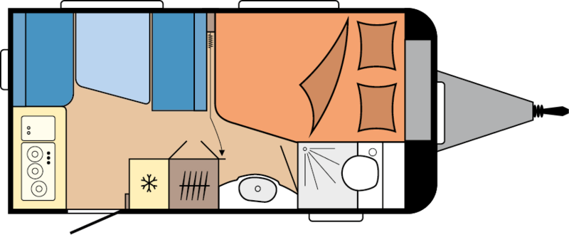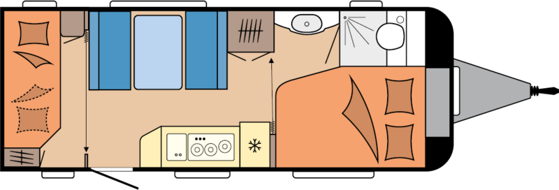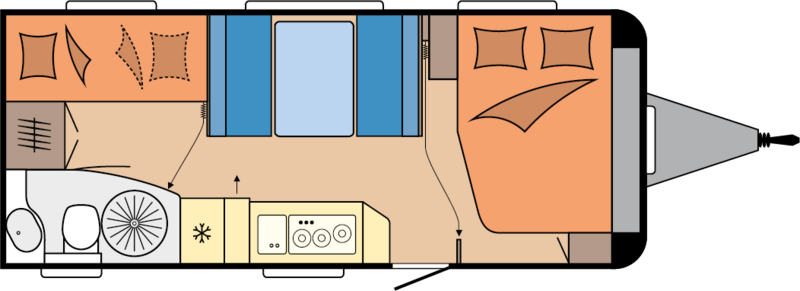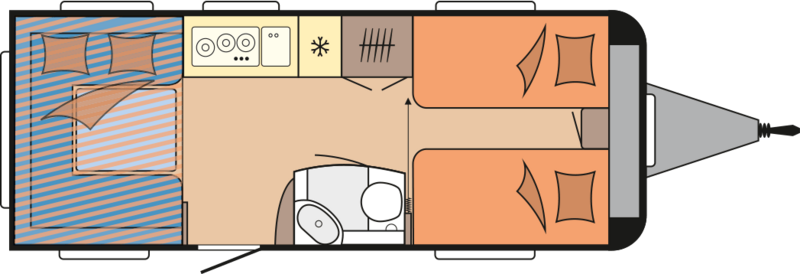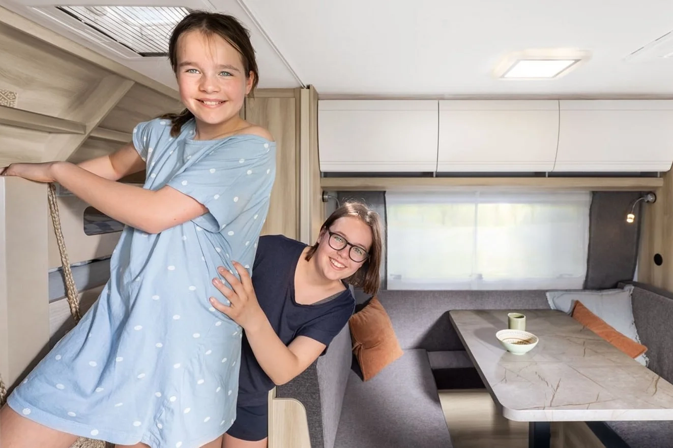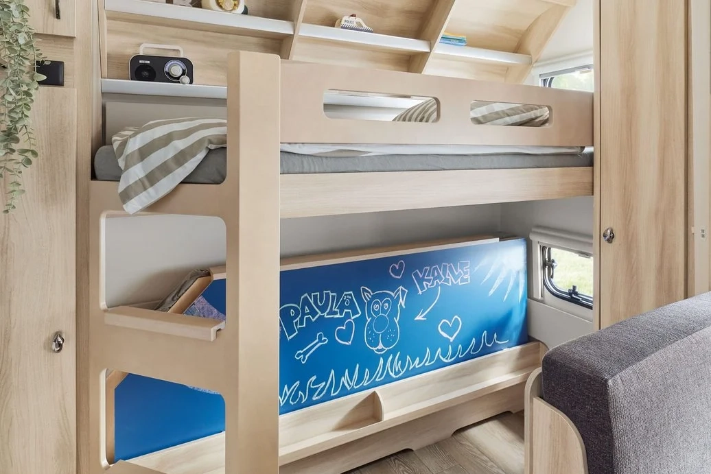 Køjerne er robuste og med plads til legetøj i de store skuffer under nederste køje. I børne-enden, er der foruden køjerne blevet plads til endnu en siddegruppe, der også kan reddes op til barn nummer tre. Endelig kan siddegruppen under hævesænke-sengen, reddes op til to, så vognen har i alt 7 soveplader.