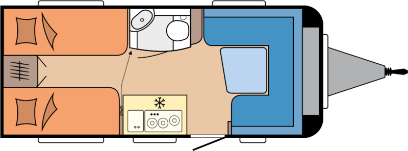 Der er badeværelse i flg. modeller 400 SFe, 460 Ufe, 495WFB (endebadeværelse), 540 FU, 540 KMFe, 545 KMF (som på billede), 56 KMFe.