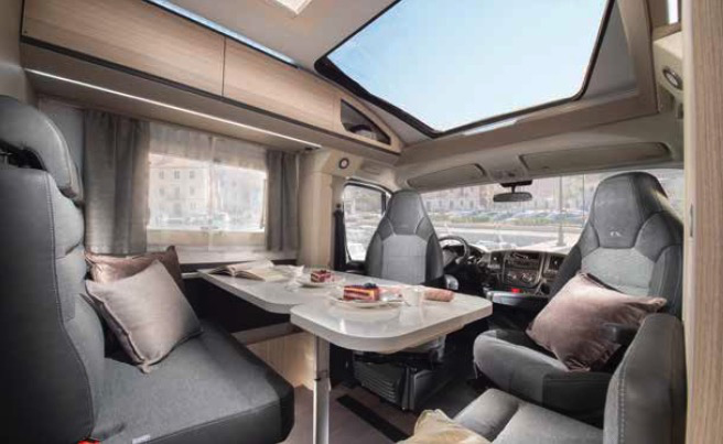 Indvendigt finder du rummelige opholdsområder i den kompakte autocamper. Den rummelige oplevelse hjælpes godt på vej af det store panorama soltag, der giver et godt lys og frit kig til himmelen.