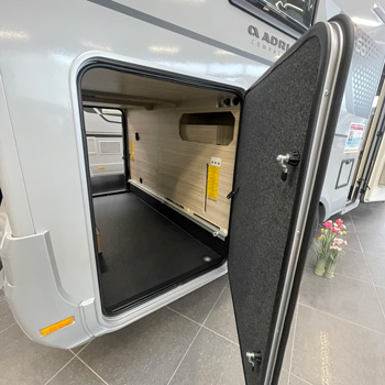 Der er stor garage med to døre, 12V/230V strømudtag og arbejdslys. Der er fleksible ankre til effektiv sikring af lasten. Det centralt placerede serviceområde giver nem adgang til tilslutningerne.