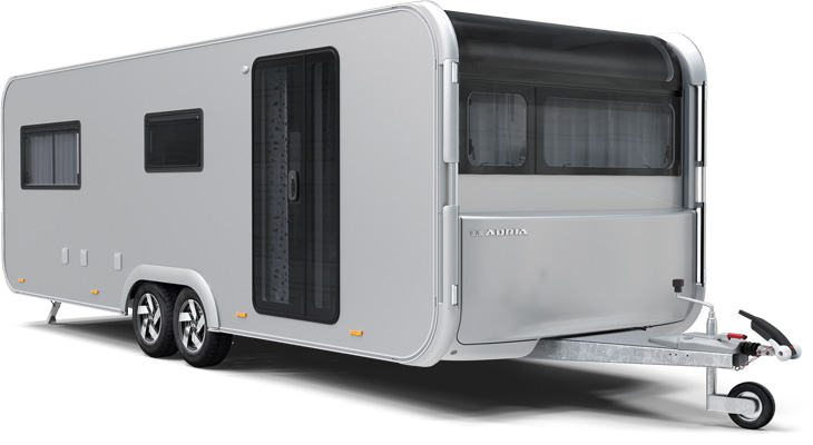 Adria New Astella 644 DP - Har perfekte indretning, med separat soveværelse og stor opholdsstue med panoramadøre. Lækkert badeværelse og stort køkken. Der er mulighed for ekstra opredning til to i siddegruppen. (Fås i flere forskellige udgaver.)