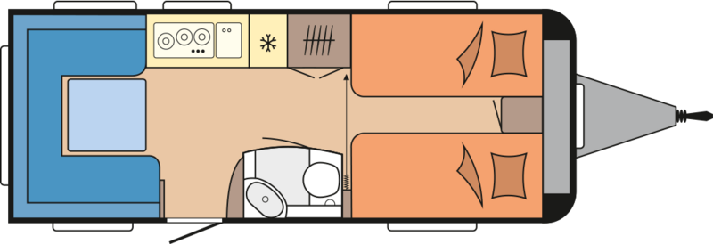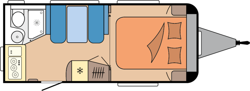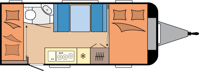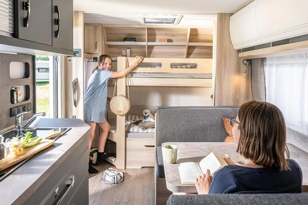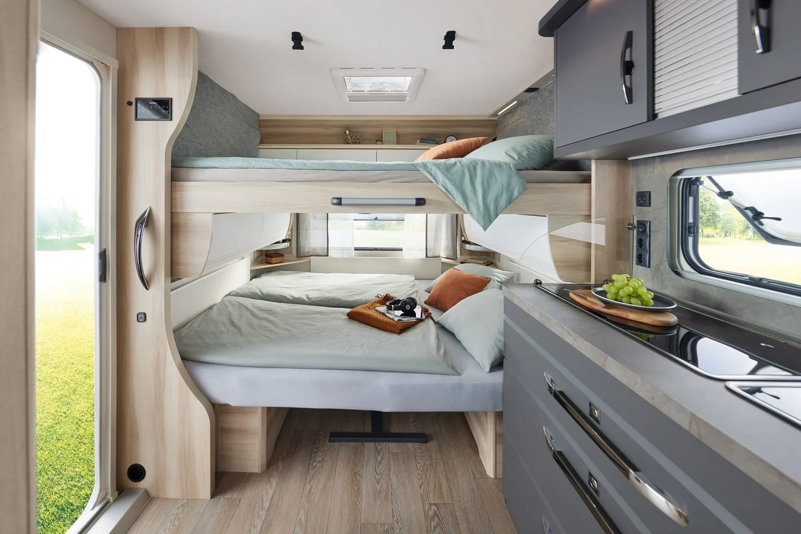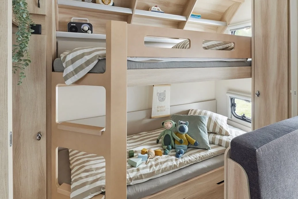 Køjerne er robuste og med plads til legetøj i de store skuffer under nederste køje. I børne-enden, er der foruden køjerne blevet plads til endnu en siddegruppe, der også kan reddes op til barn nummer tre. Endelig kan siddegruppen under hævesænke-sengen, reddes op til to, så vognen har i alt 7 soveplader.