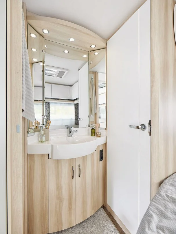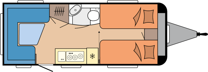 Der er badeværelse i flg. modeller 400 SFe, 460 Ufe, 495WFB (endebadeværelse), 540 FU, 540 KMFe, 545 KMF (som på billede), 56 KMFe.