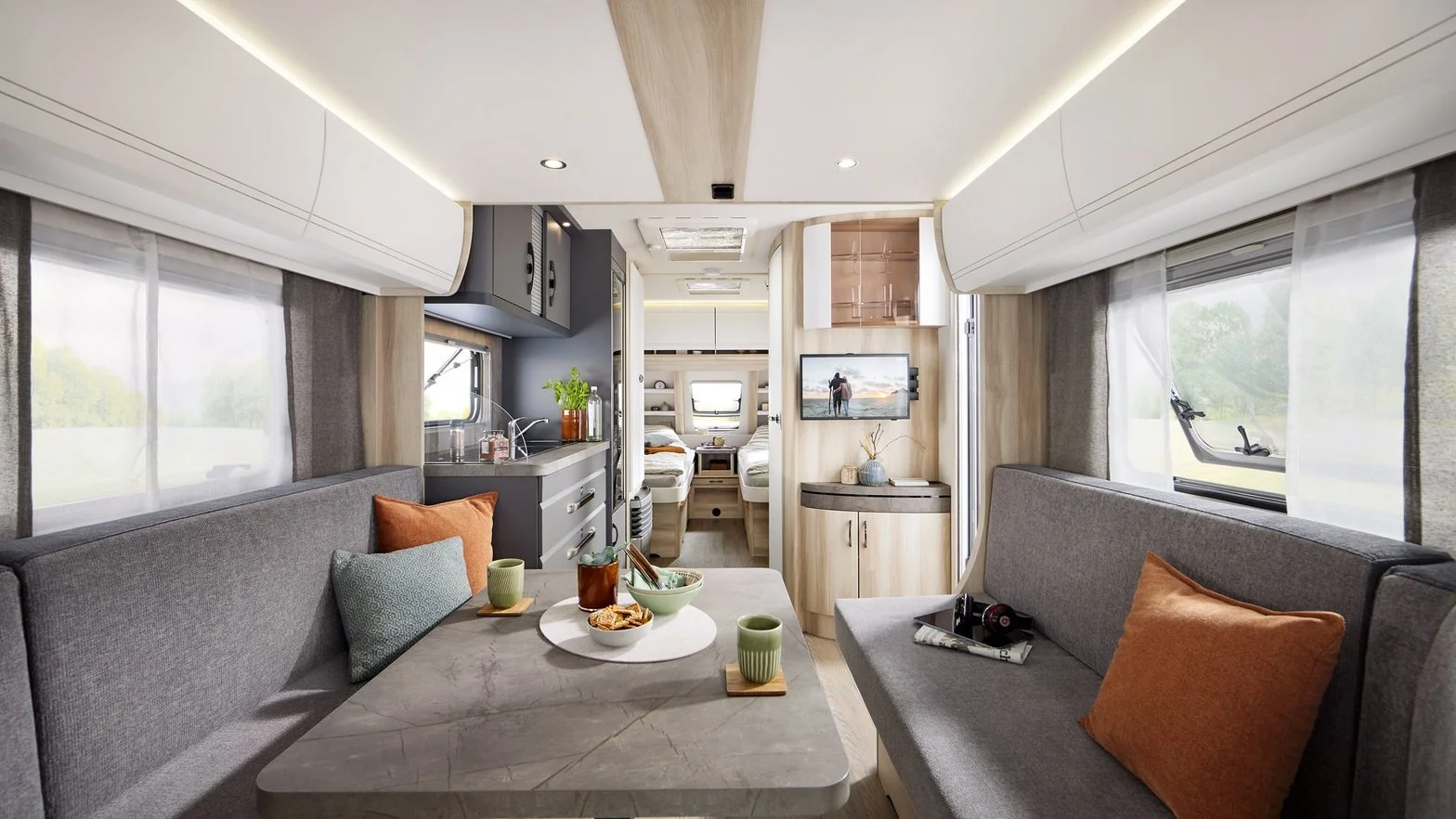 Hobby DE LUXE - har masser af teknologi og et ungt design, der passer godt til den moderne familie. Samtidig har vognen 12 forskellige indretninger der tiltaler både børnefamilier og par.