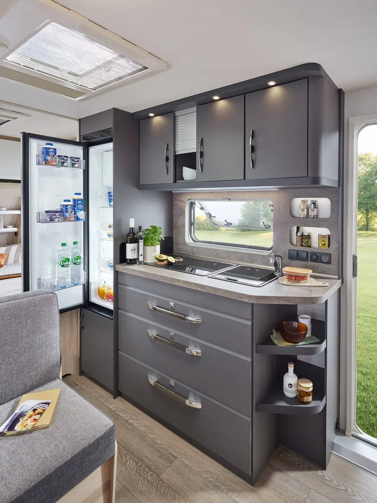 Hobby DE LUXEs køkkener er let tilgængelige og med rummelige soft-push-skuffer og skabe, så der er plads til alt service.