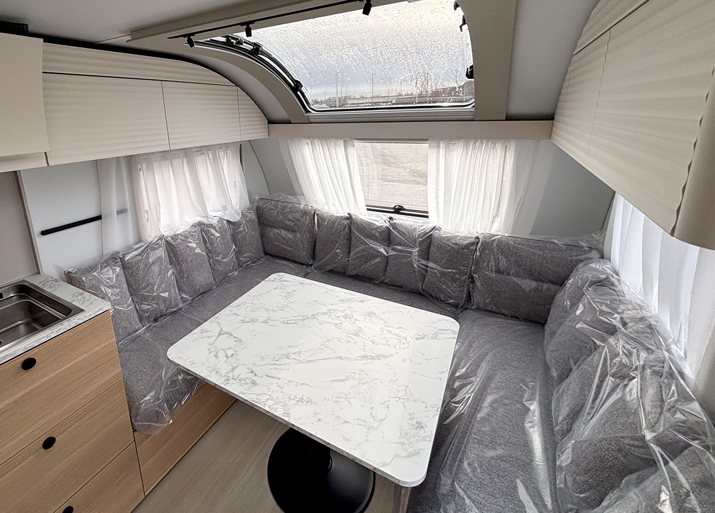 Adora har fået ny indretning og en af de gode nyheder er siddegrupppe. For hånden på hjertet, så sidder vi helst på langs med benene oppe og god med puder i ryggen. Har I gæster på besøg er der også plads til dem i denne 663 UT.